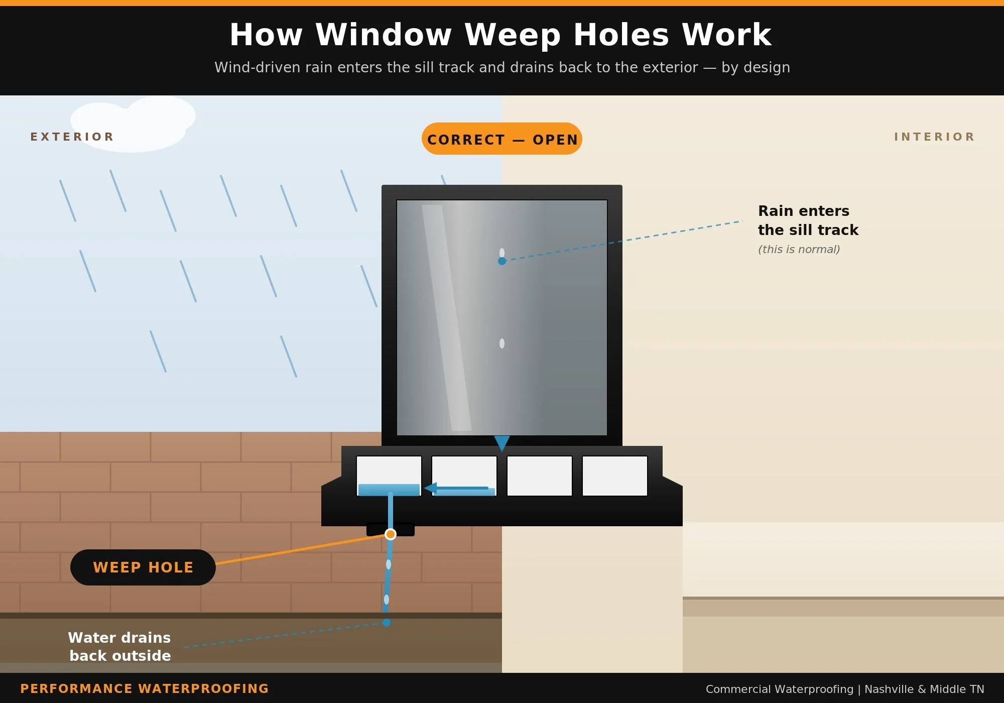 Windows are not meant to be 100% watertight. Wind-driven rain, especially the kind we regularly see during Nashville thunderstorms and spring storm cycles, pushes moisture past the outer seals and into the sill track. That's normal. What makes a window system work is that the water has a way out.