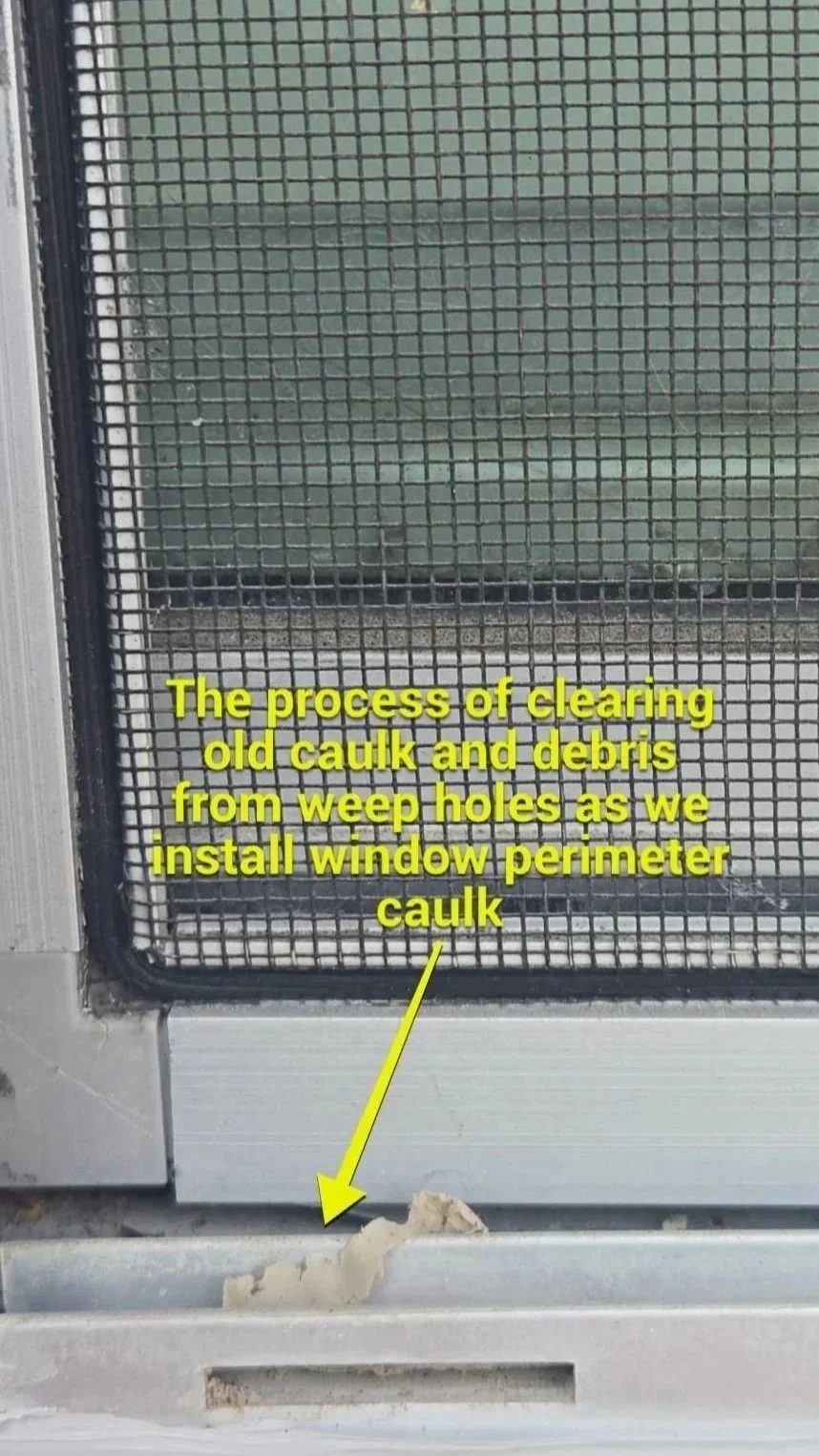 Our crew clearing old caulk and debris from the weep hole during window perimeter caulk installation. The correct approach: seal the perimeter joints, keep the weep holes open.