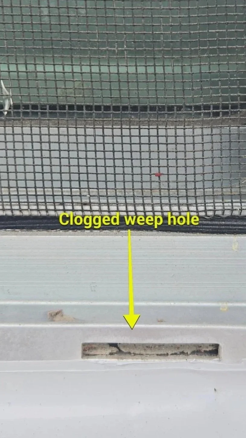 On a recent Nashville apartment building project, we documented the two most common failure modes on a single window: fully clogged weep holes and expired window caulk